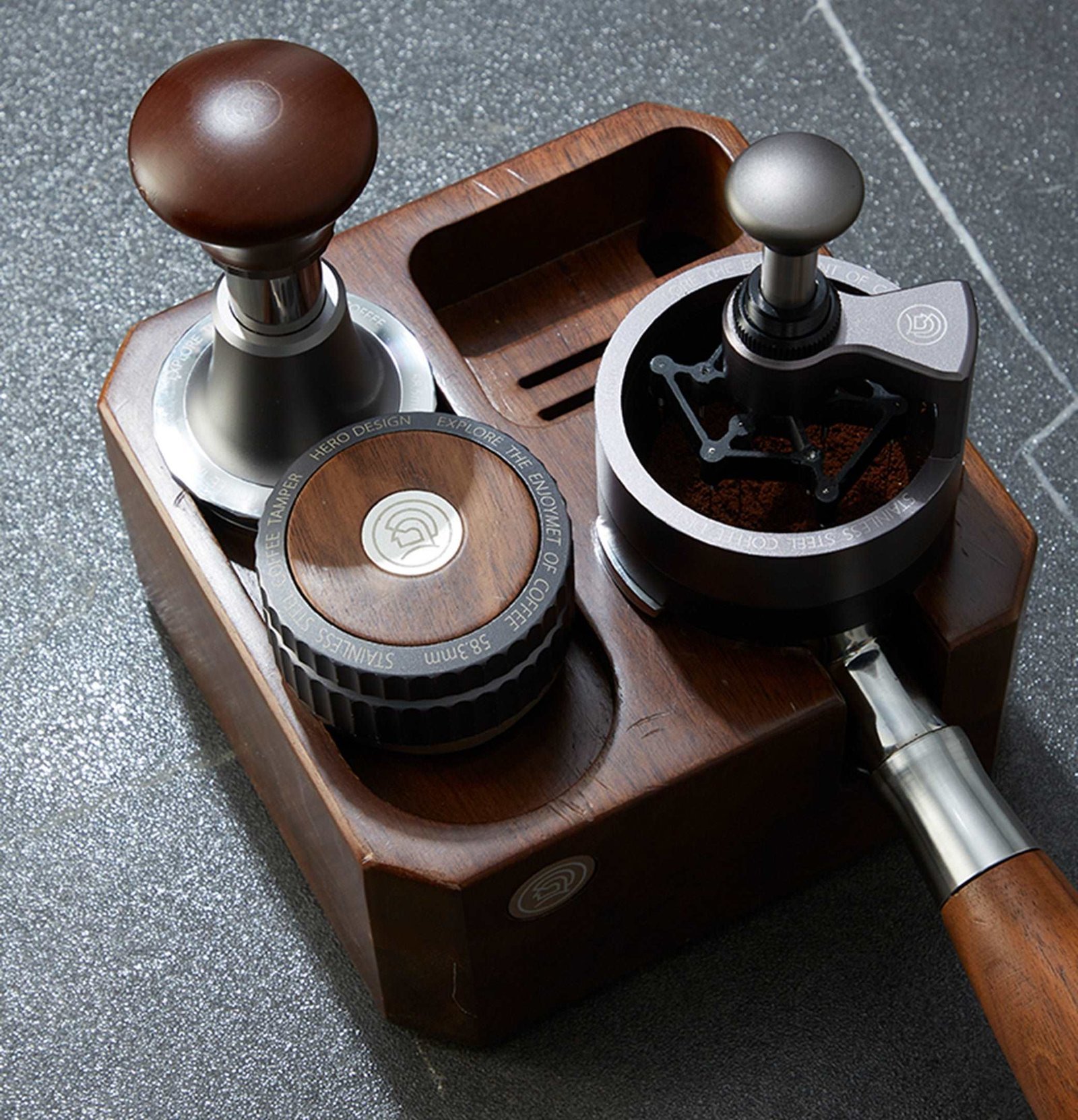 Este distribuidor para espresso es compatible con portafiltros de 58mm, el estándar en máquinas profesionales y semiprofesionales. Está fabricado en aluminio anodizado con acabado negro mate y textura grabada con láser, lo que no solo le da durabilidad, sino también un look elegante y profesional.