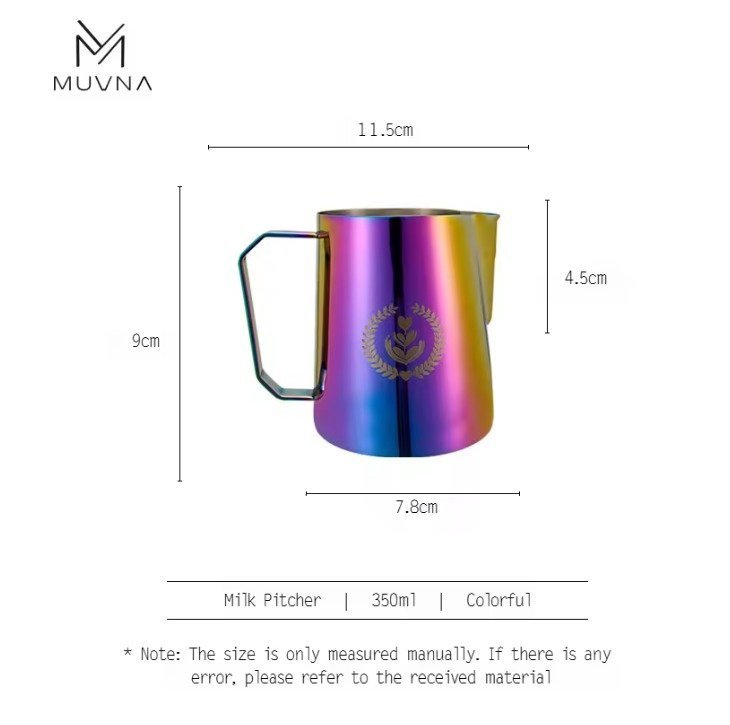 La Jarra para Leche Multicolor 350ml, MUVNA es una herramienta esencial para baristas que buscan precisión, estilo y versatilidad en la preparación de bebidas con leche. Disponible en capacidades de 350 ml, 450 ml y 600 ml, se adapta a las necesidades de diferentes volúmenes de preparación.