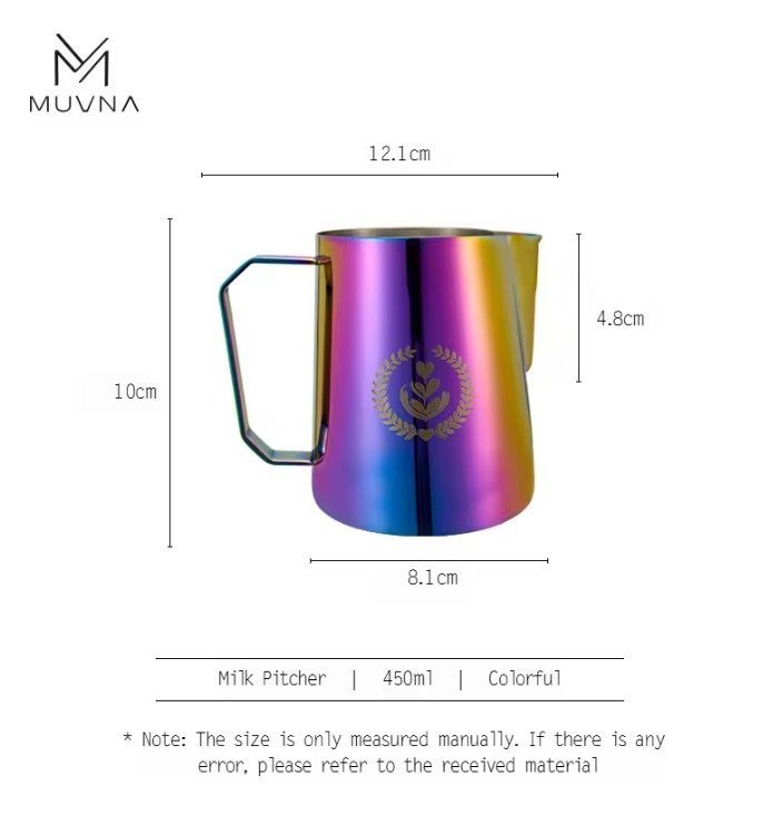 La Jarra para Leche Multicolor 450ml, MUVNA es una herramienta esencial para baristas que buscan precisión, estilo y versatilidad en la preparación de bebidas con leche. Disponible en capacidades de 350 ml, 450 ml y 600 ml, se adapta a las necesidades de diferentes volúmenes de preparación.