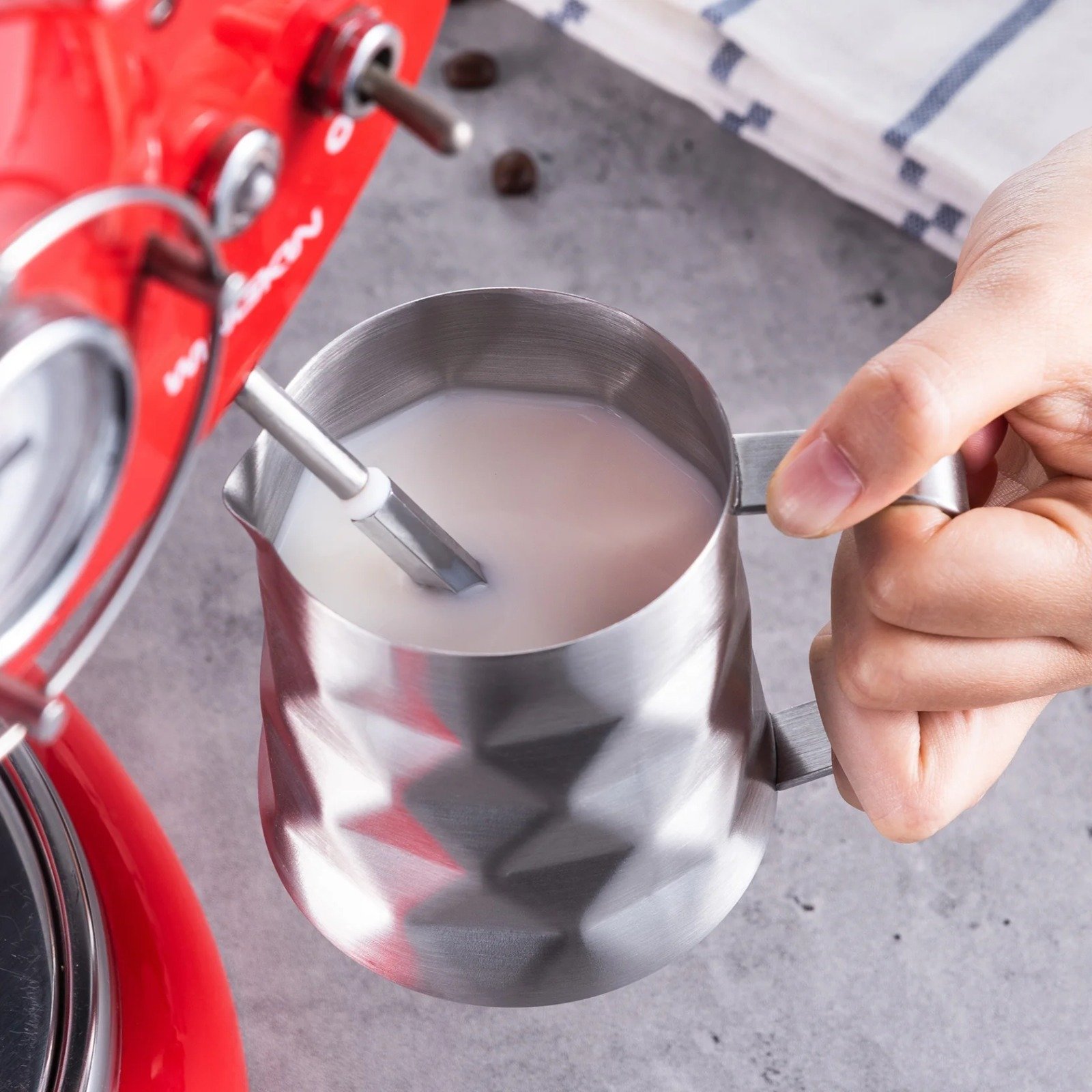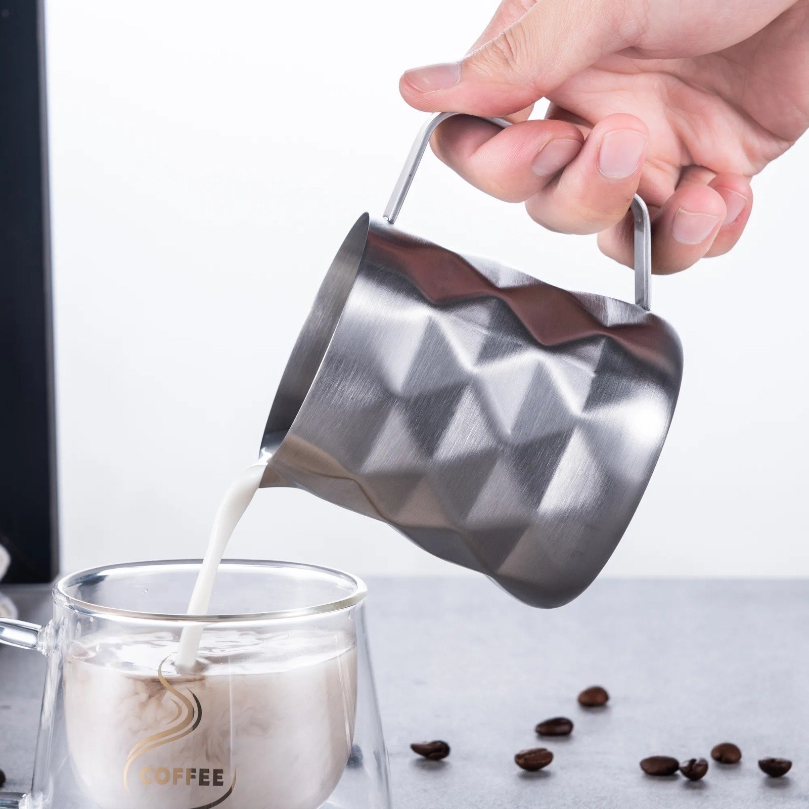 Fabricada con acero inoxidable 304 de grado alimenticio, esta jarra garantiza resistencia al óxido y manchas. Su durabilidad y diseño ergonómico hacen que sea esencial para cualquier barista.