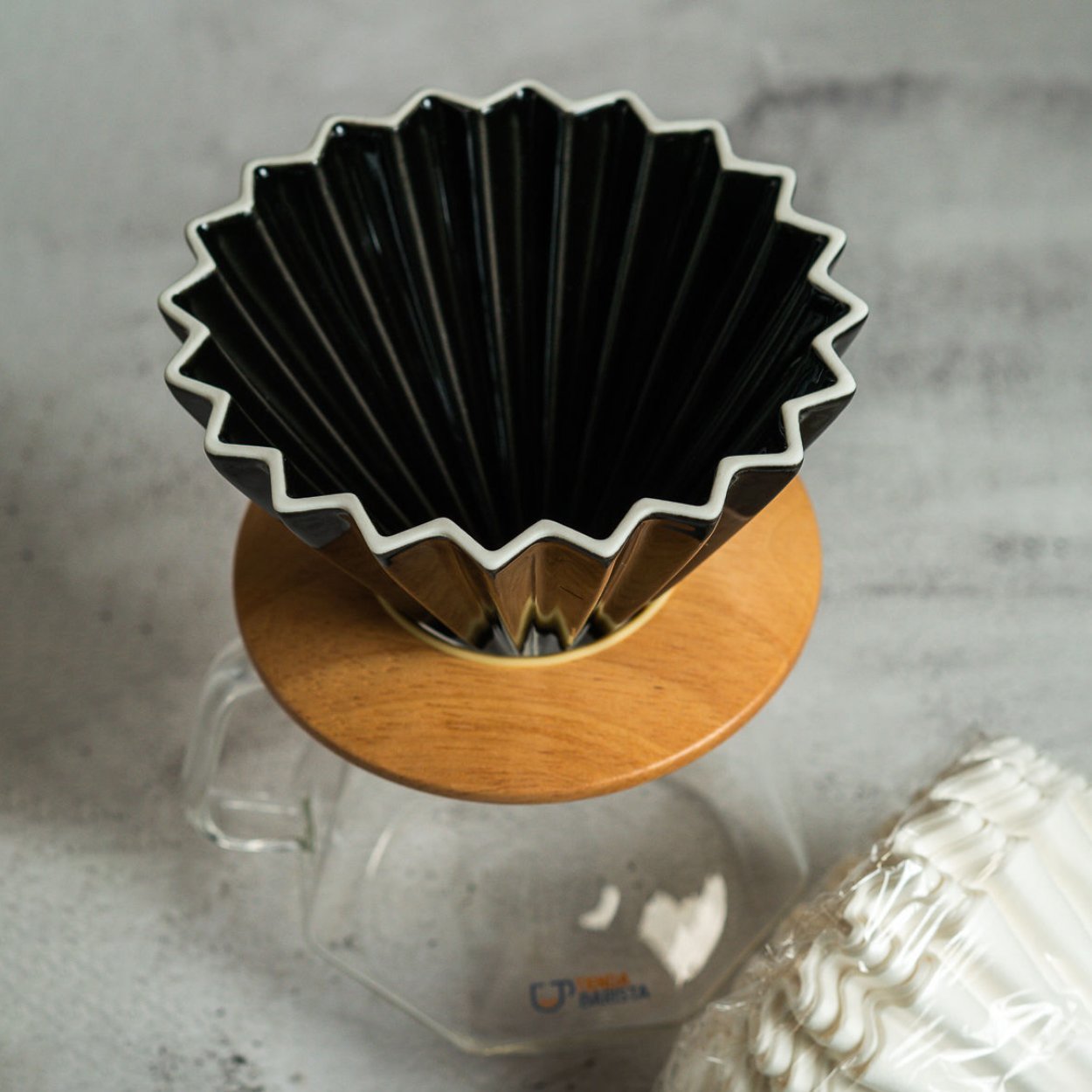 Descubre la excelencia en cada taza: Sumérgete en el mundo del café japonés con nuestro Kit Origami Negro. El Dripper Origami de 4 tazas te garantiza una extracción uniforme, mientras que la Jarra Diamante de 600 ml y los 50 Filtros Ondulados elevan la pureza de cada gota.