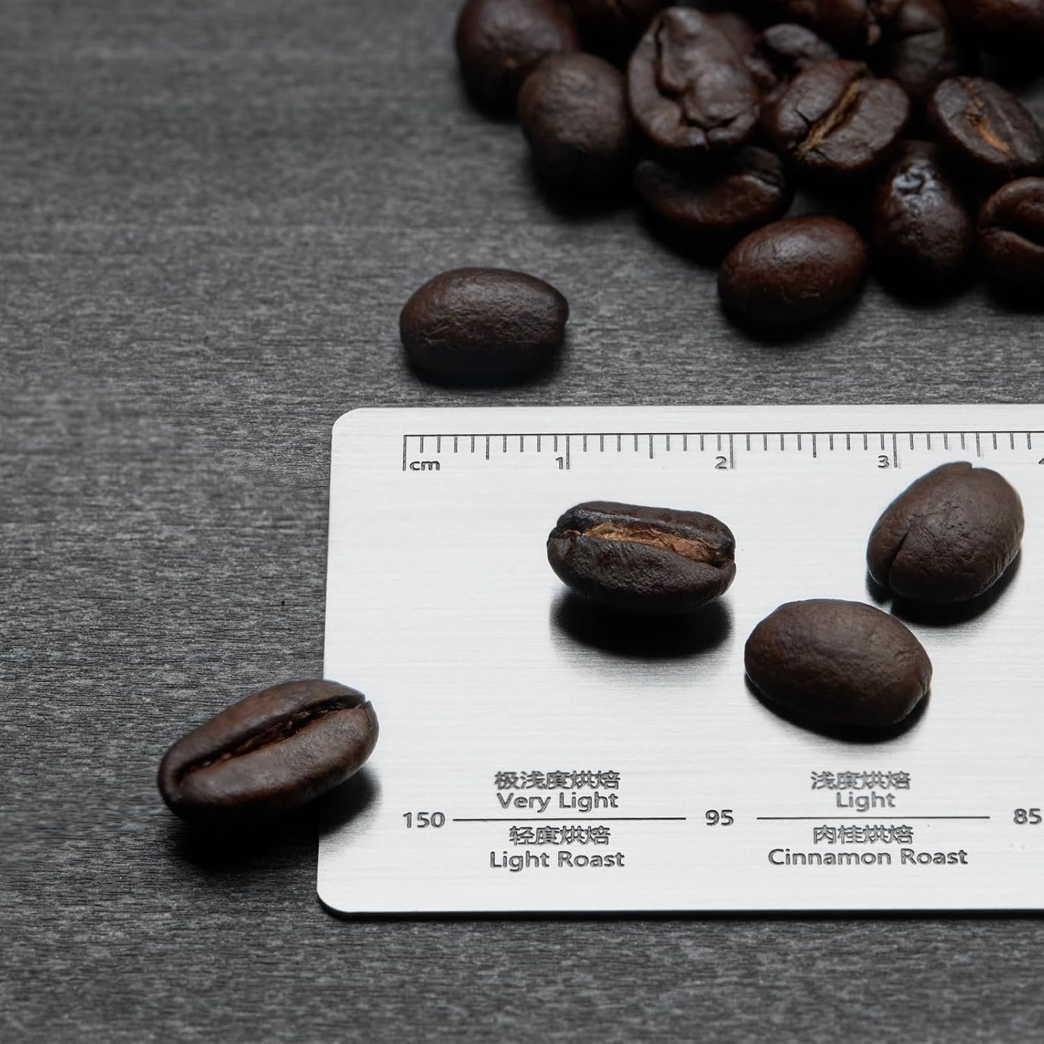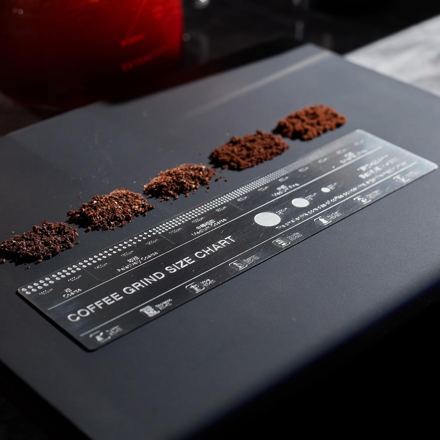 Con una escala detallada que abarca desde moliendas gruesas para prensa francesa hasta extracciones ultrafinas para espresso y café turco, esta regla permite evaluar visualmente el tamaño del café molido con exactitud. Su diseño rectangular facilita la comparación rápida y eficiente en el flujo de trabajo de cualquier barista.